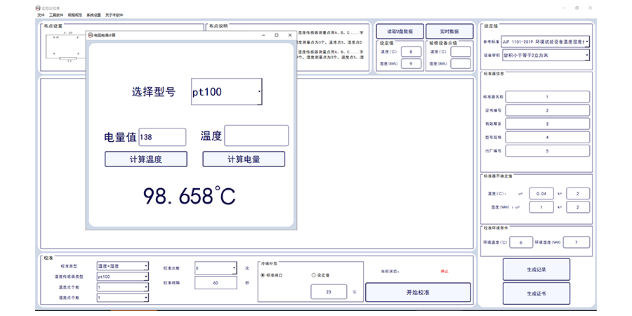 上位機軟件可進行規(guī)范選擇,可進行校準類型、傳感器類型,校準次數(shù),校準間隔設(shè)置,生成excel的單條記錄/word的證書記錄。