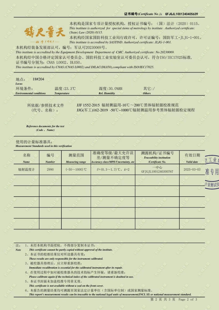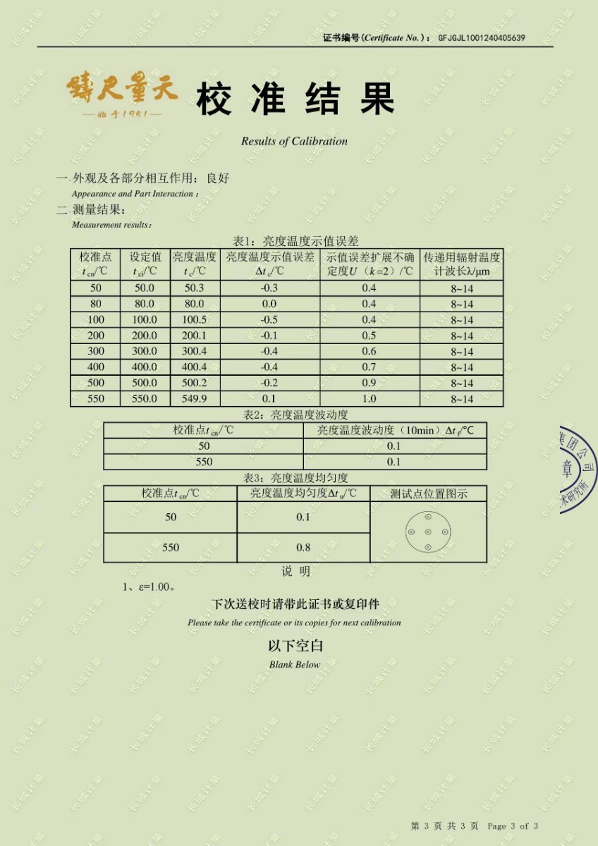 黑體爐校準證書 2024-4-24 本文被閱讀 10257 次