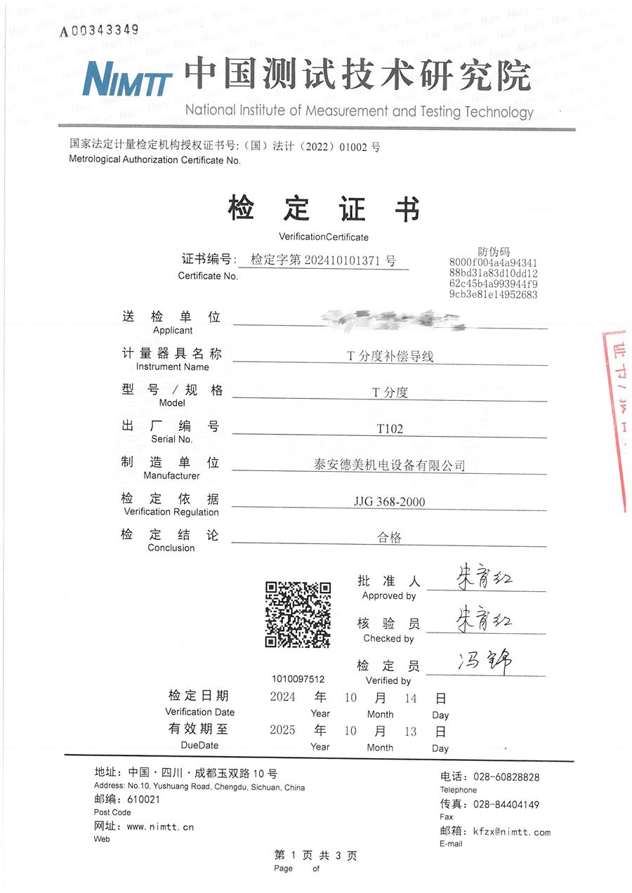 T分度補償導線檢定證書 2024-10-17 本文被閱讀 7063 次