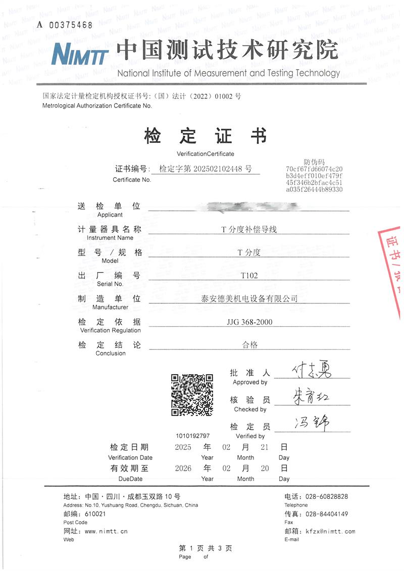 T分度補(bǔ)償導(dǎo)線檢定證書 2025-2-25 本文被閱讀 5309 次