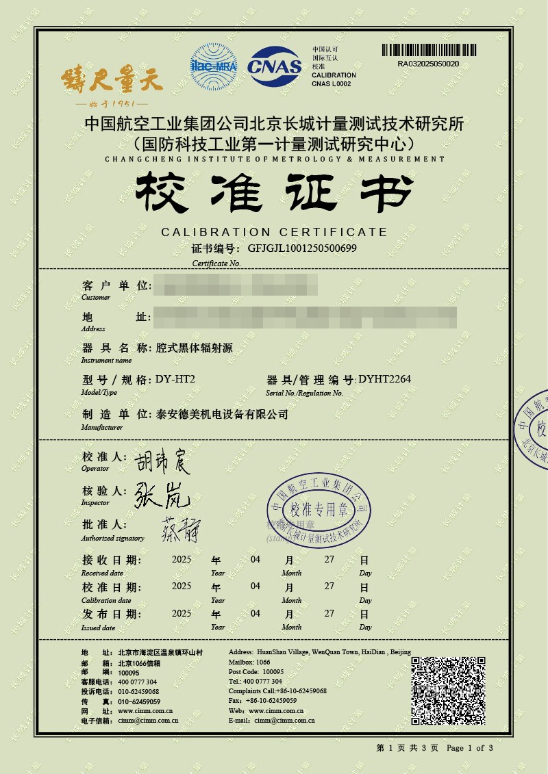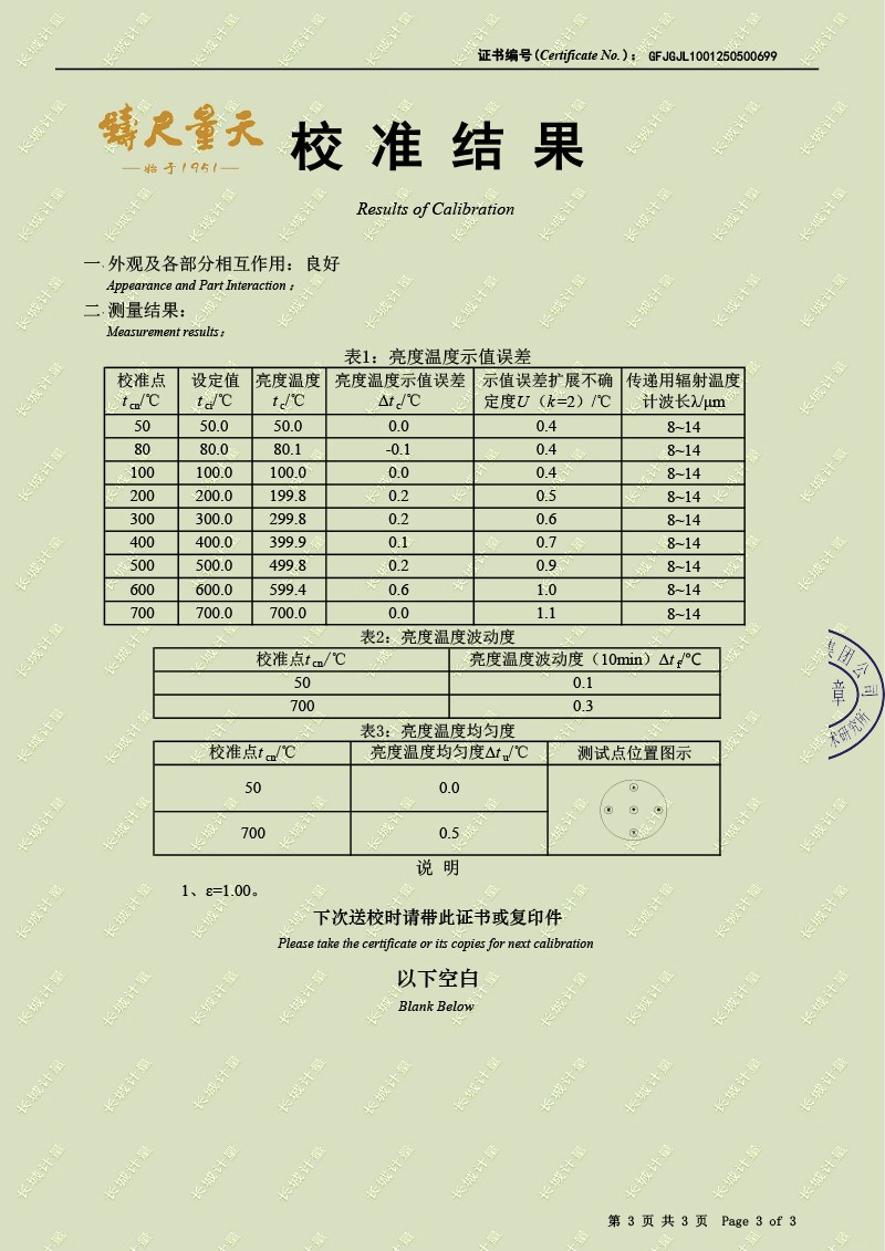 腔式黑體輻射源(50-700℃)校準(zhǔn)證書 2025-5-9 本文被閱讀 3593 次