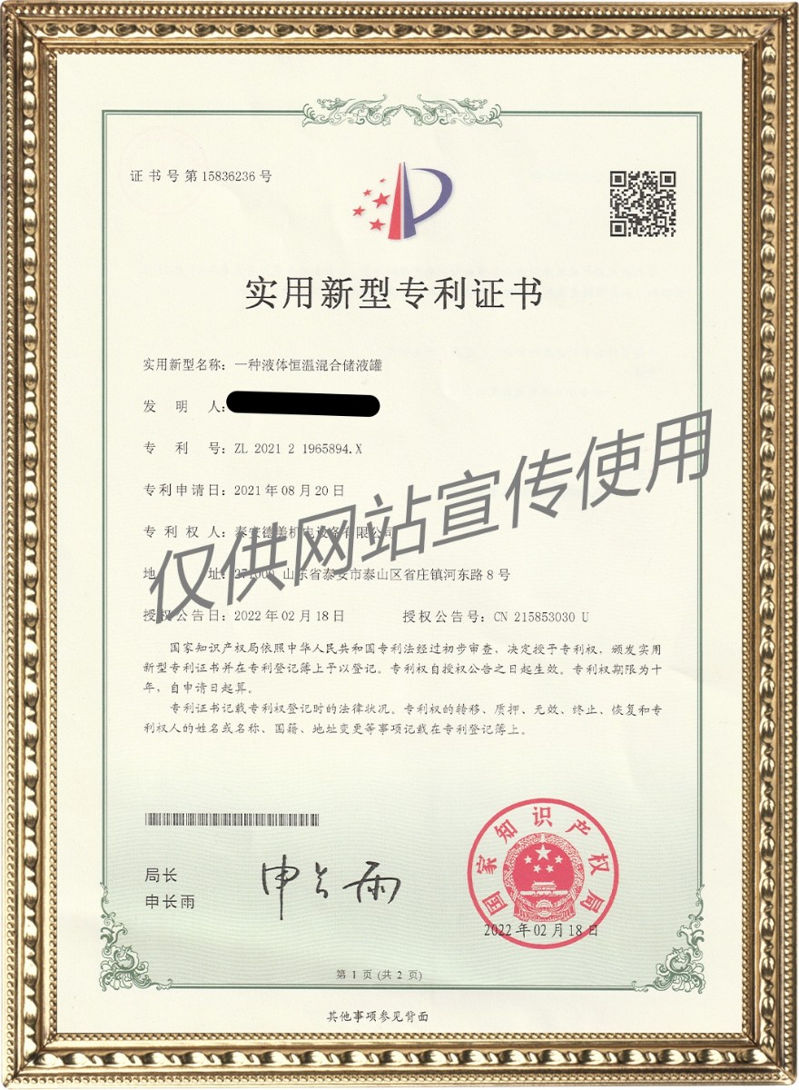 一種液體恒溫混合儲液罐——實用新型專利證書 2023-2-7 本文被閱讀 15269 次