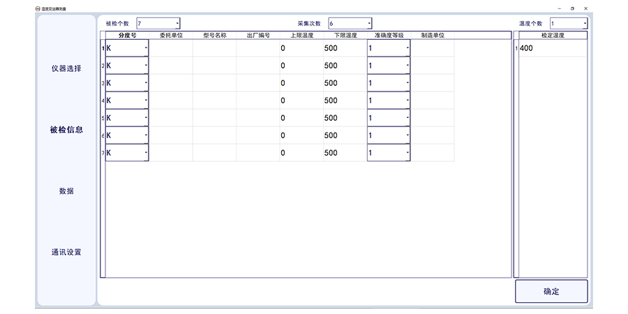 溫度變送器計量校準(zhǔn)上位機(jī)軟件,此軟件適合溫度變送器的輸出電流采集,軟件需要溫度變送器(帶傳感器)配套標(biāo)準(zhǔn)器、恒溫設(shè)備及相應(yīng)數(shù)字萬用表。軟件可選擇多個被檢傳感器,可設(shè)置采集次數(shù),及溫度個數(shù)及溫度點。軟件可輸入委托單位,型號名稱出廠編號及準(zhǔn)確度等級及制造單位。