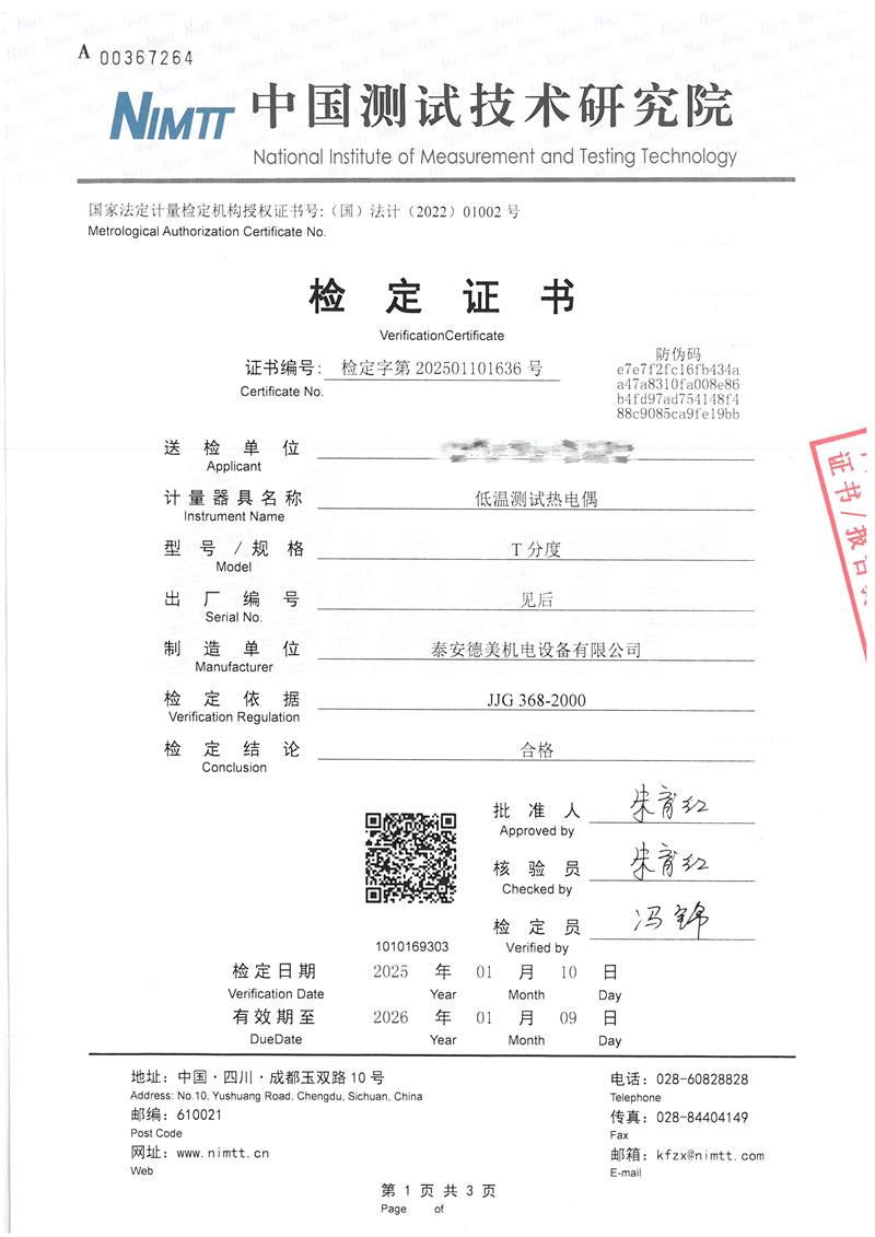 (T型)低溫測(cè)試熱電偶檢定證書 2025-1-13 本文被閱讀 6276 次