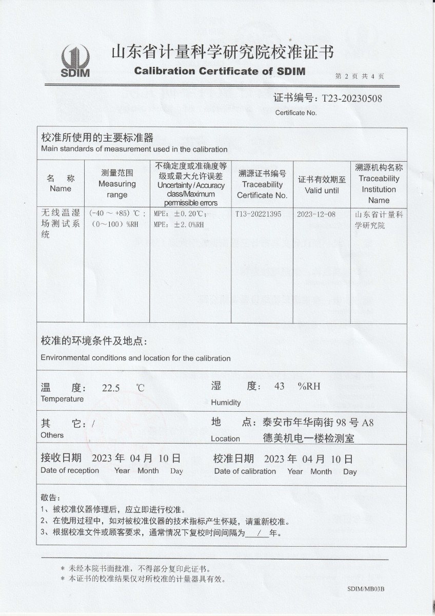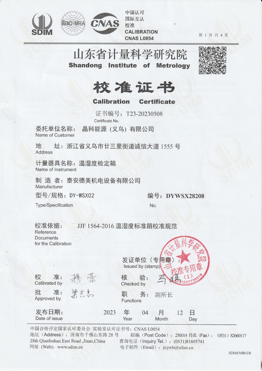 晶科能源(義烏)有限公司 溫濕度檢定箱 校準(zhǔn)證書 2023-5-4 本文被閱讀 14232 次
