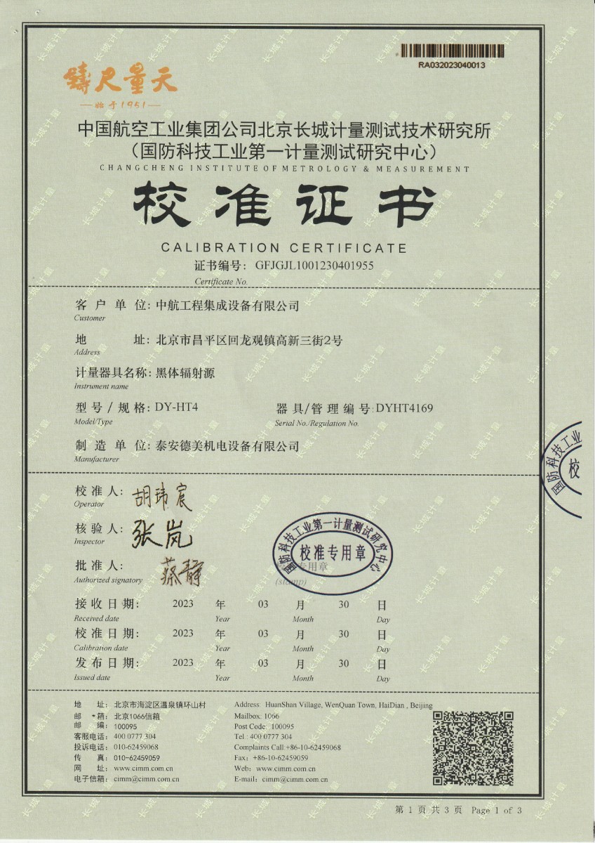 | 上一條:浙江弘志計(jì)量測試有限公司 黑體輻射源 校準(zhǔn)證書 | 下一條:DY-HT2M-C高溫面源黑體爐(100mm) |
