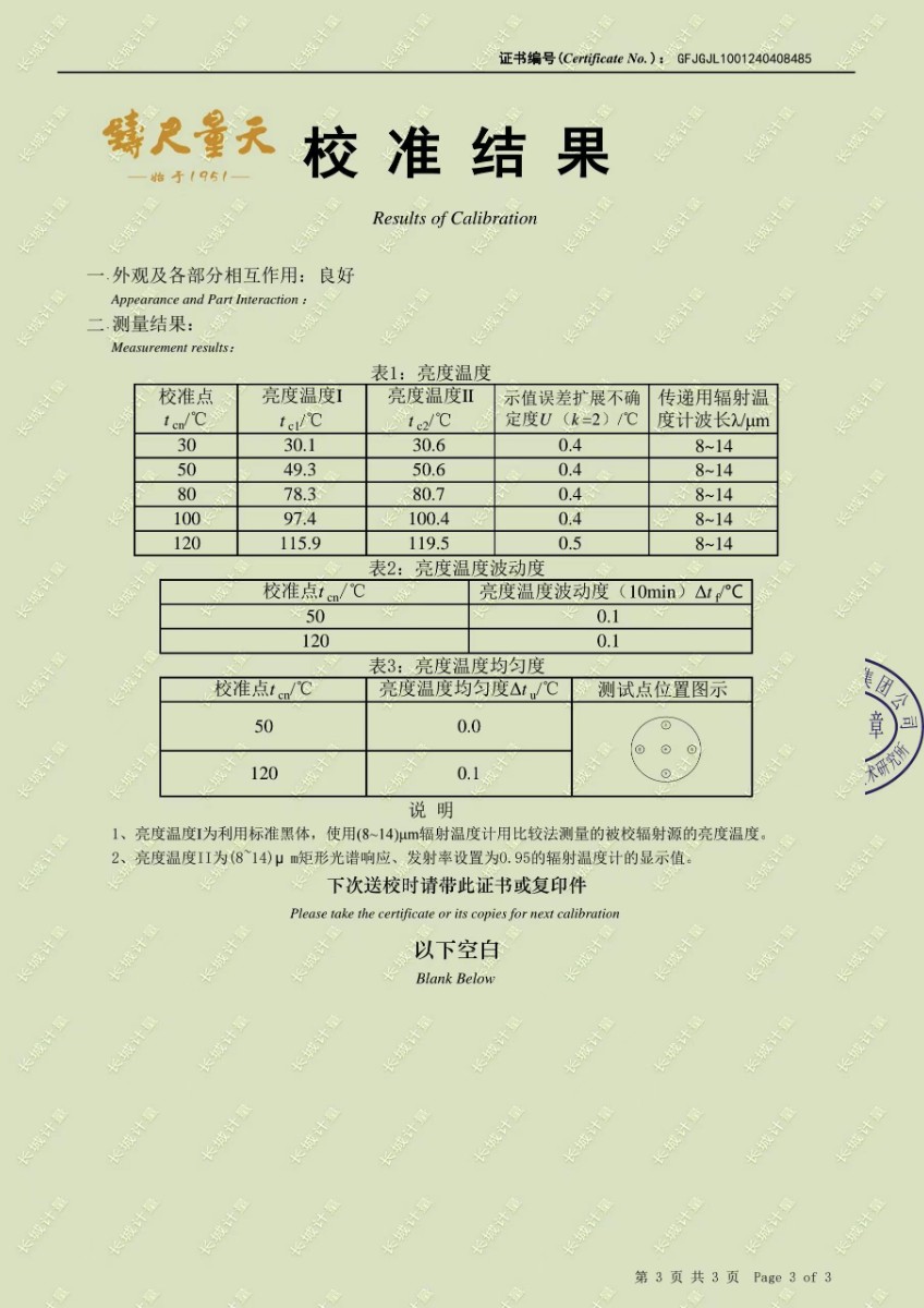小尺寸高精度中溫黑體校準證書 2024-4-24 本文被閱讀 7966 次