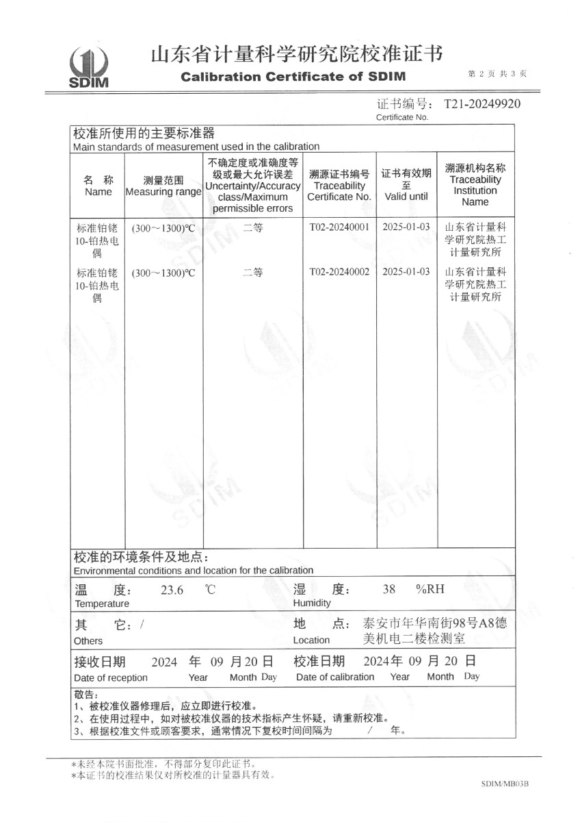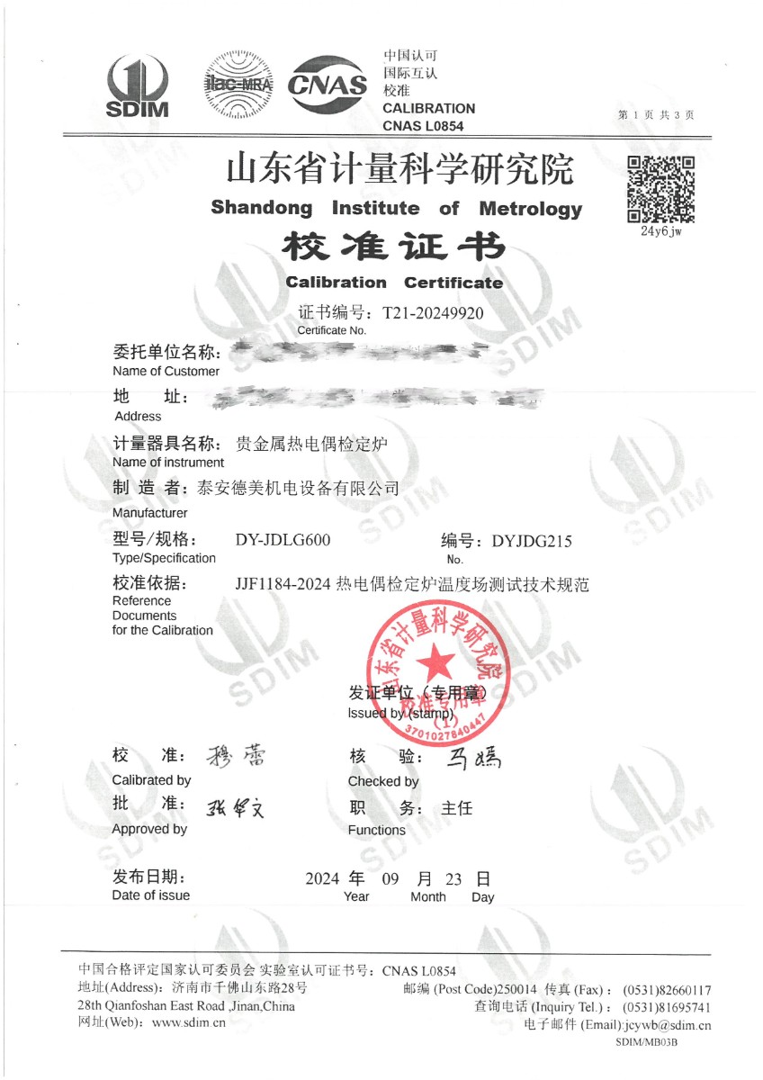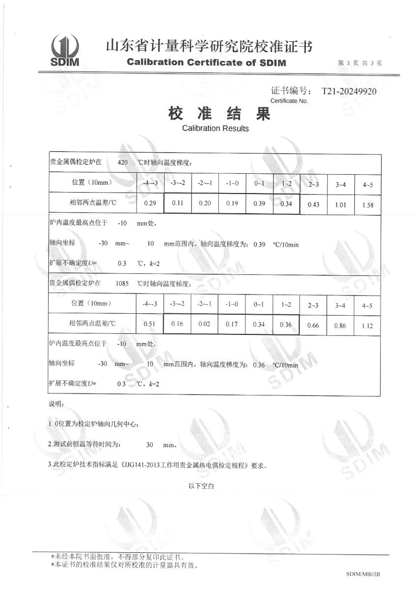 貴金屬熱電偶檢定爐(300~1000℃)校準證書 2024-9-24 本文被閱讀 7218 次