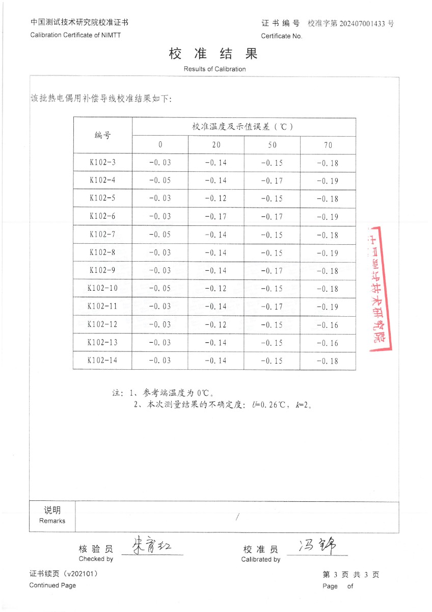熱電偶用補(bǔ)償導(dǎo)線K分度校準(zhǔn)證書