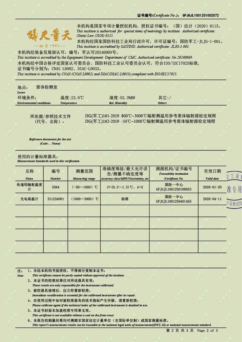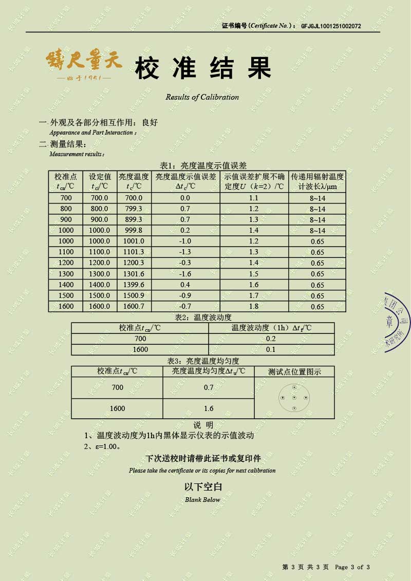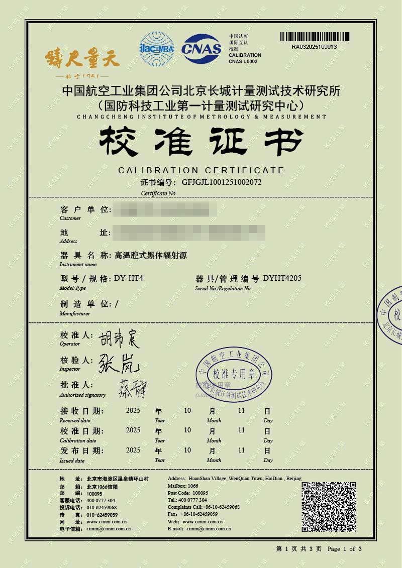 | 上一條:低溫液槽式黑體爐(-40-100℃)校準(zhǔn)證書 | 下一條:DY-HT2M-C高溫面源黑體爐(100mm) |
