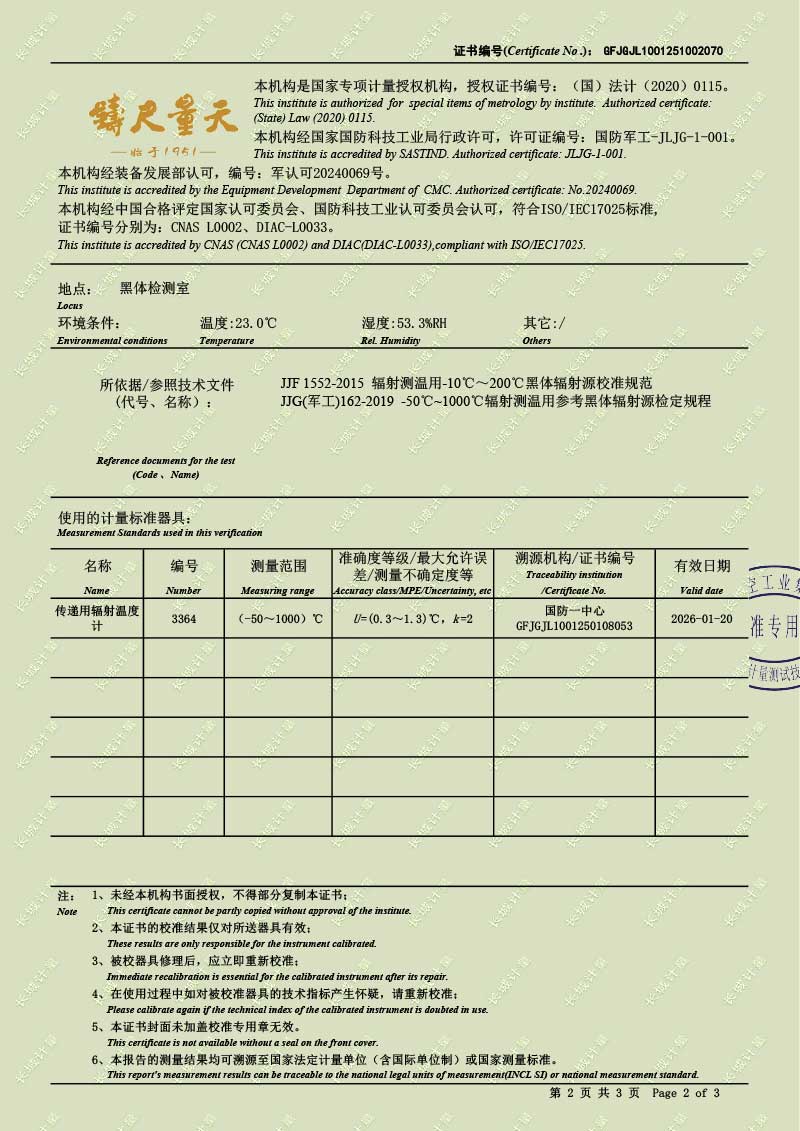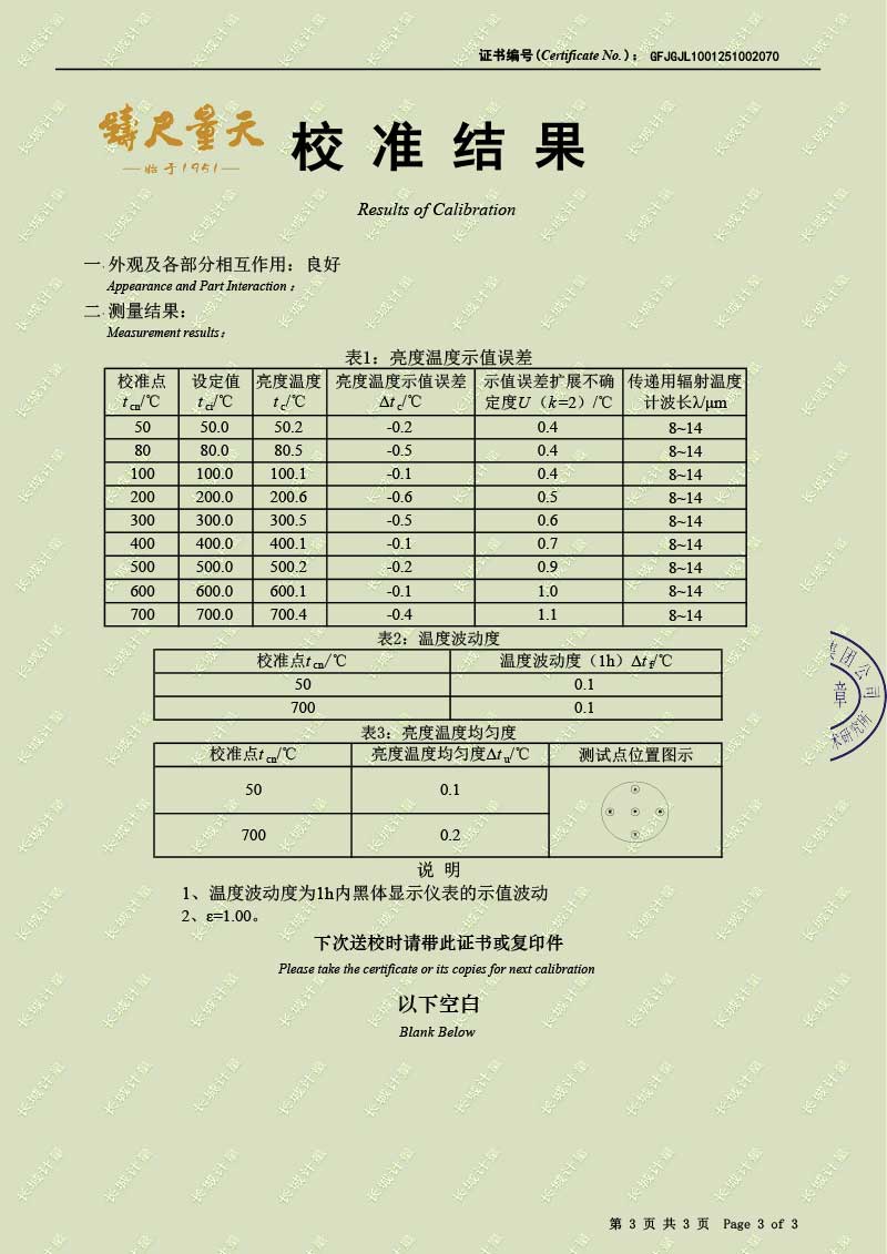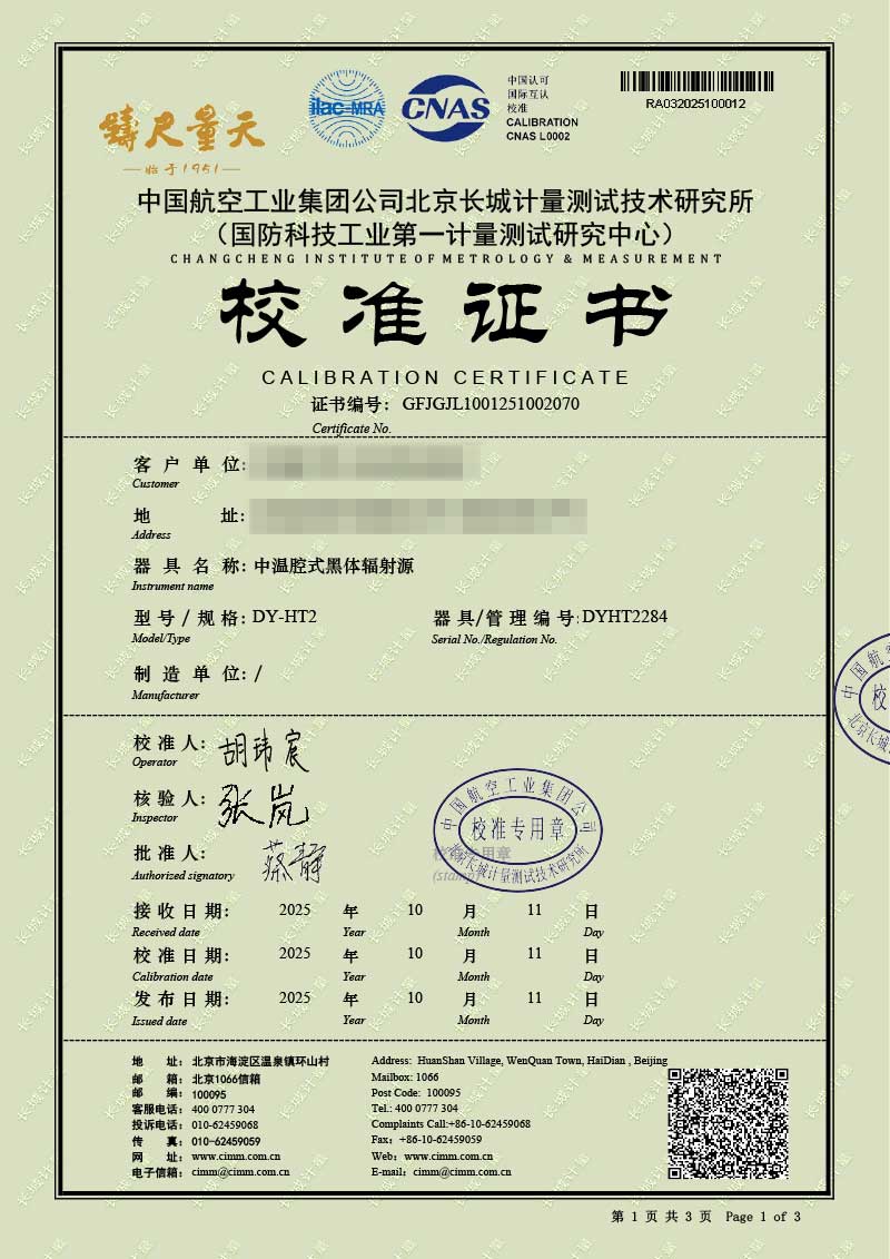 | 上一條:高溫腔式黑體輻射源(700-1600℃)校準(zhǔn)證書(shū) | 下一條:DY-HT2M-C高溫面源黑體爐(100mm) |