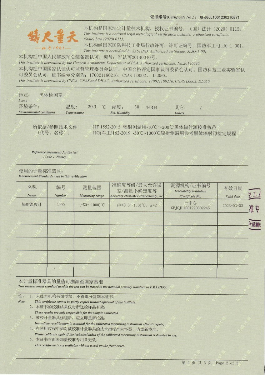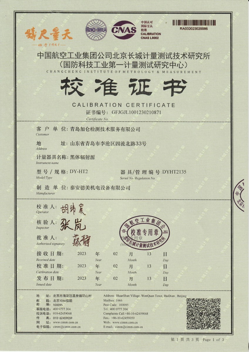青島加侖檢測技術(shù)服務(wù)有限公司 黑體輻射源 校準(zhǔn)證書 2023-2-25 本文被閱讀 14237 次
