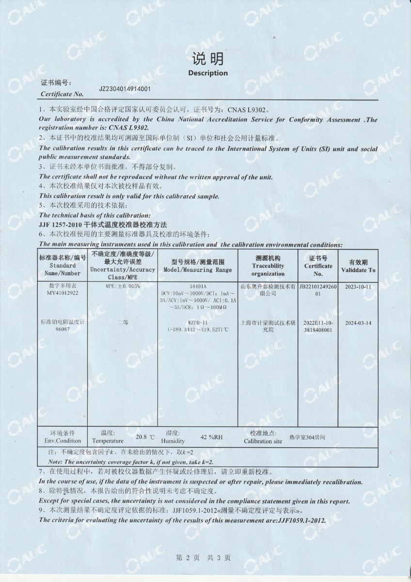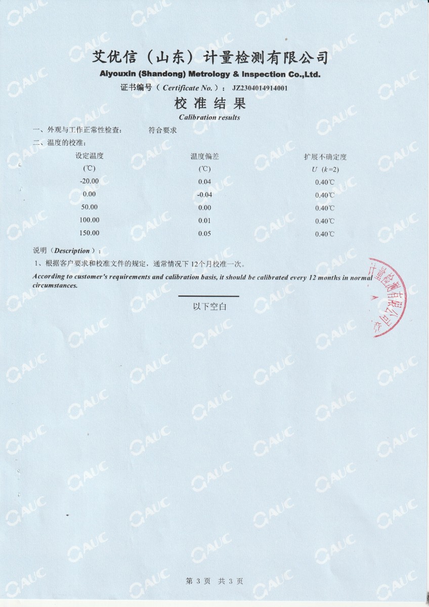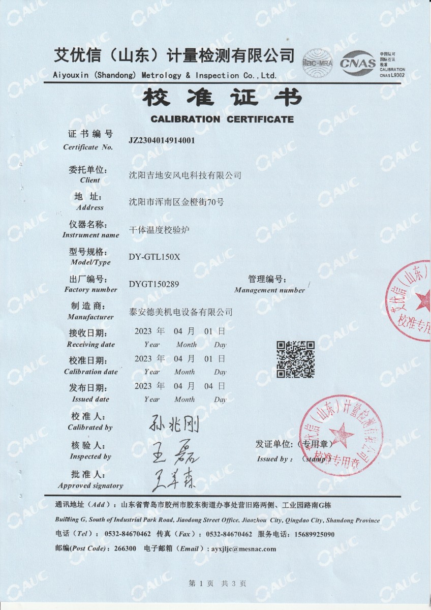 沈陽吉地安風電科技有限公司 干體溫度校驗爐 校準證書(1) 2023-4-15 本文被閱讀 13786 次