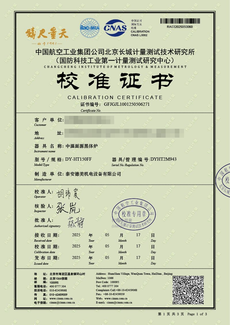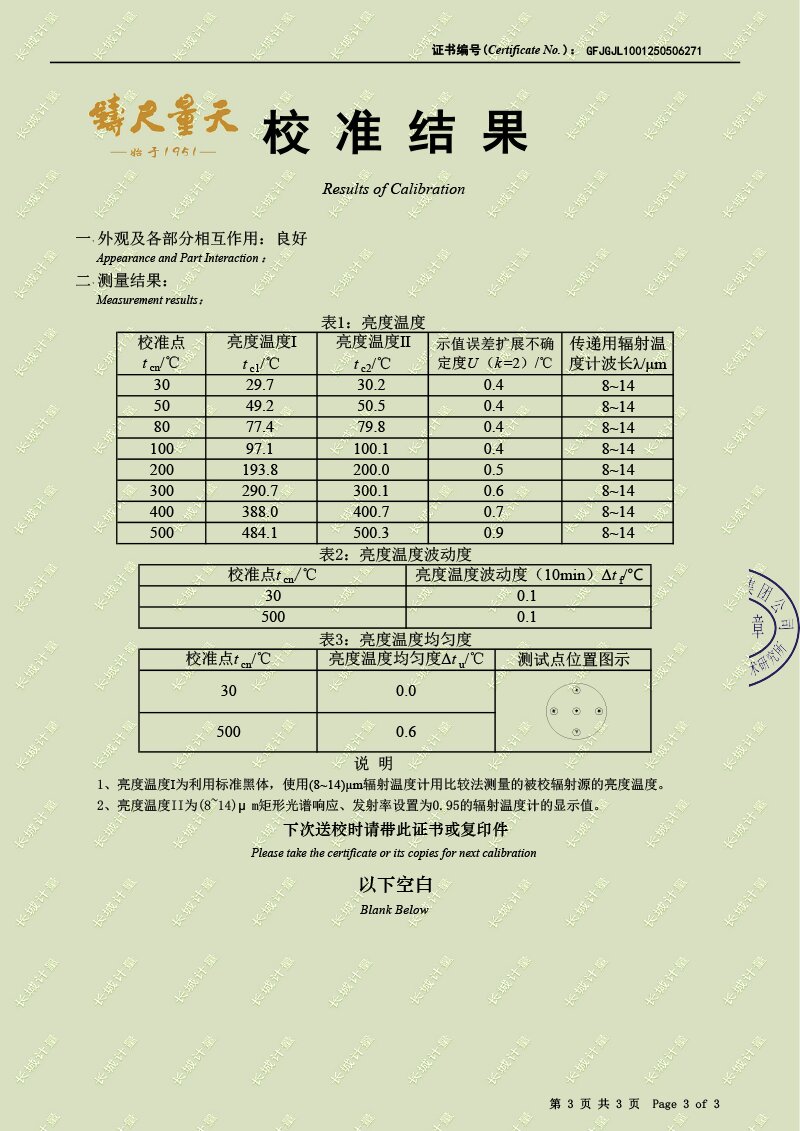 中溫面源黑體爐(室溫+5-500℃)校準證書 2025-5-21 本文被閱讀 4129 次