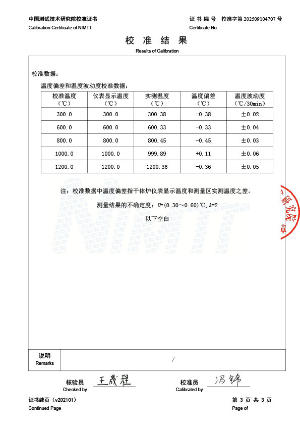 高溫干體爐(300-1200℃)校準(zhǔn)證書